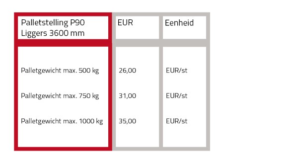 Onderstaande tabellen geven een indicatie van de kosten. De onderstaande prijzen betreffen standaard palletstellingen, bij andere type stellingen moet u rekening houden met een meerprijs.
