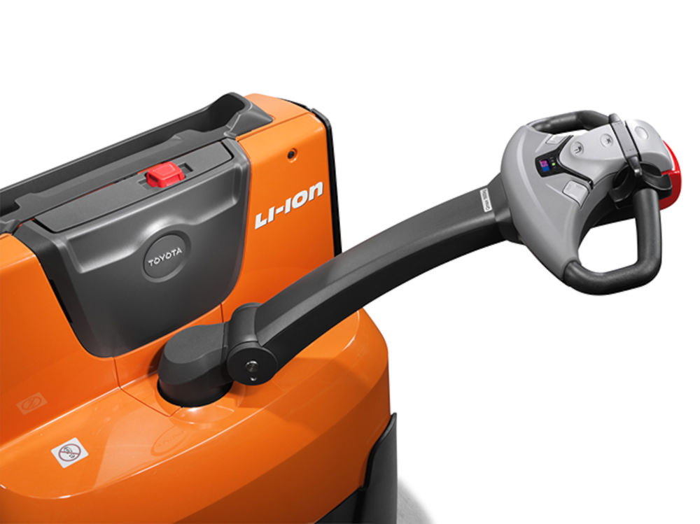 De ergonomische handgreep met intuïtieve bedieningsknoppen kan met beide handen worden gebruikt, voor een uitstekende controle en productiviteit. De Click-2-Creep-functie laat kruipen toe en maakt het ook mogelijk om te rijden terwijl de stuurarm rechtop staat.