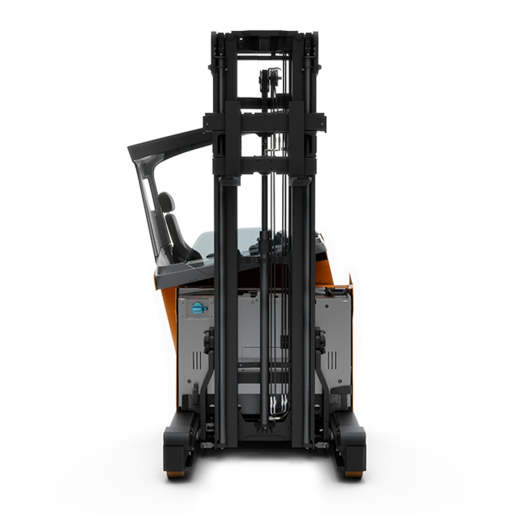 Reachtruck met hoge hefhoogtes en unieke kantelbare cabine voor maximale productiviteit, ergonomie en veiligheid.