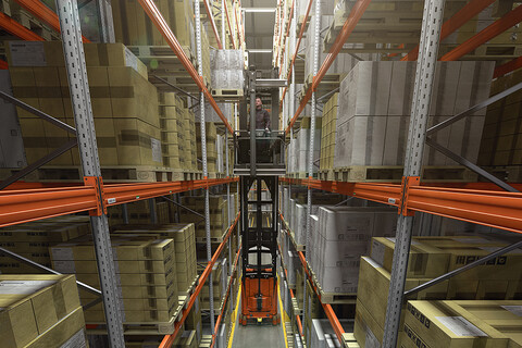 - Orderverzameling op hoog niveau en handling van pallets in gangpaden met inductie of railgeleiding
